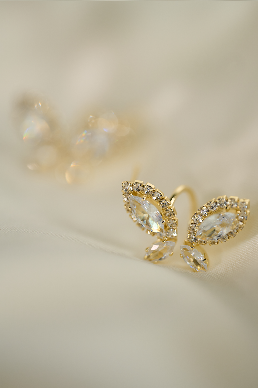 Estos aretes en forma de mariposa destacan por su brillo y delicadeza. Elaborados en tono dorado, están decorados con piedras en talla marquesa y un aro que rodea las alas con gemas más pequeñas que realzan su resplandor.