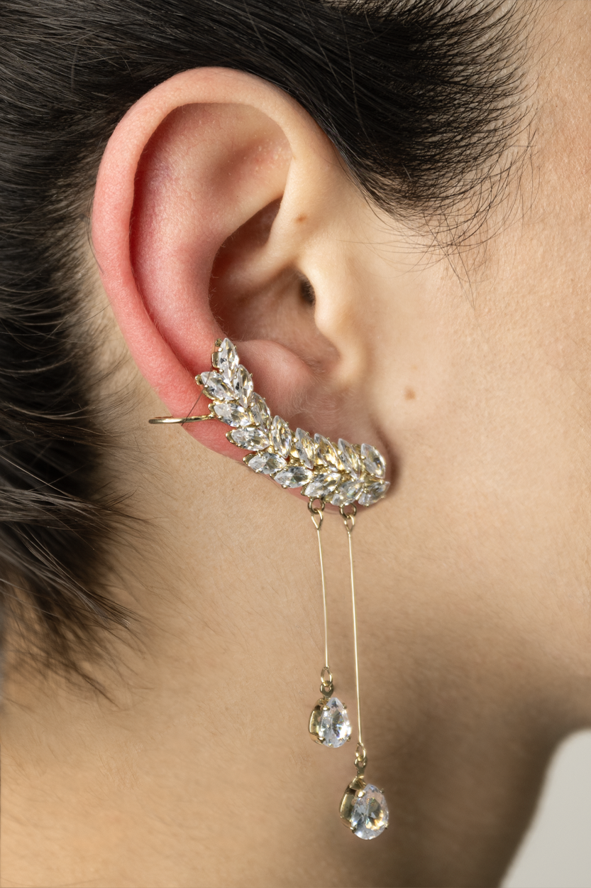 Su diseño en tono dorado presenta una fila de cristales en corte marquesa que se adaptan a la curvatura de la oreja, creando un efecto de hojas brillantes. Dos delicadas cadenas con gemas en forma de gota cuelgan sutilmente, aportando movimiento y sofisticación.